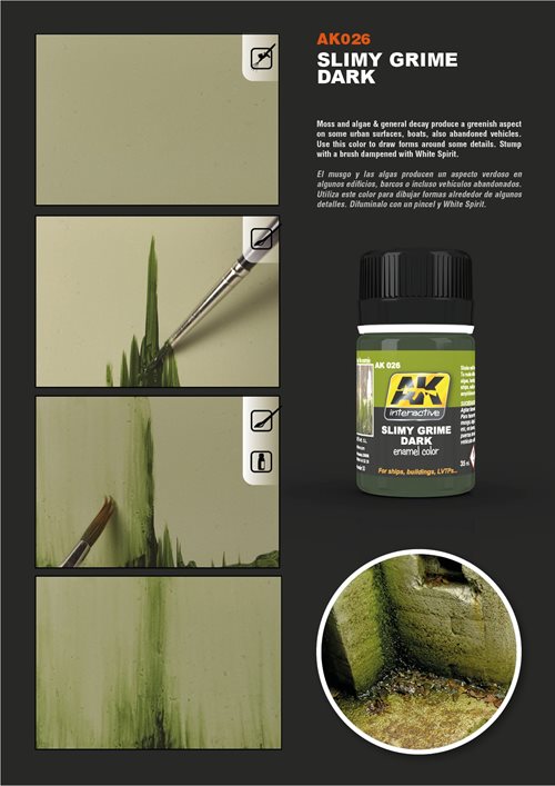 This dark green colored effect is perfect for creating fresh moss and slimy surfaces caused by dampness. Apply and fade with a clean brush moist with Enamel Thinner. Ships, boats, ports, wooden doors and many amphibious vehicles show this effect very particular due to the water and the humidity. Observe real pictures to use them like reference in your models.