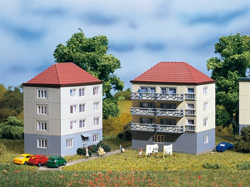 Die Architektur von Mehrfamilienhäusern in den Jahren um 1950 und 1960 war in ganz Deutschland ähnlich. Sie haben die Wahl! Dem Bausatz liegen je 2 Flachdächer und 2 Ziegelwalmdächer bei.