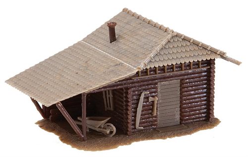 A log cabin with axe, saw and wheel barrow which absolutely should be positioned in the forest.