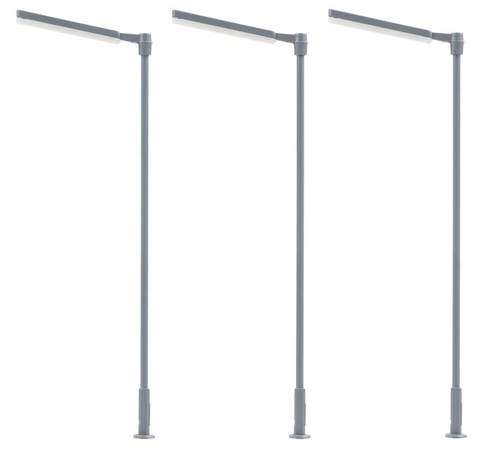Upgrade your model railway with the atmospheric 'Faller 180121 LED cross mast lights'. This set consists of three single cool white LED lights that will add a realistic and modern touch to any H0 scale railway model. With a height of 95 mm, these lights are designed to mimic real-life cross mast lights and are perfect for illuminating stations, city scenes or other central points on your layout.
