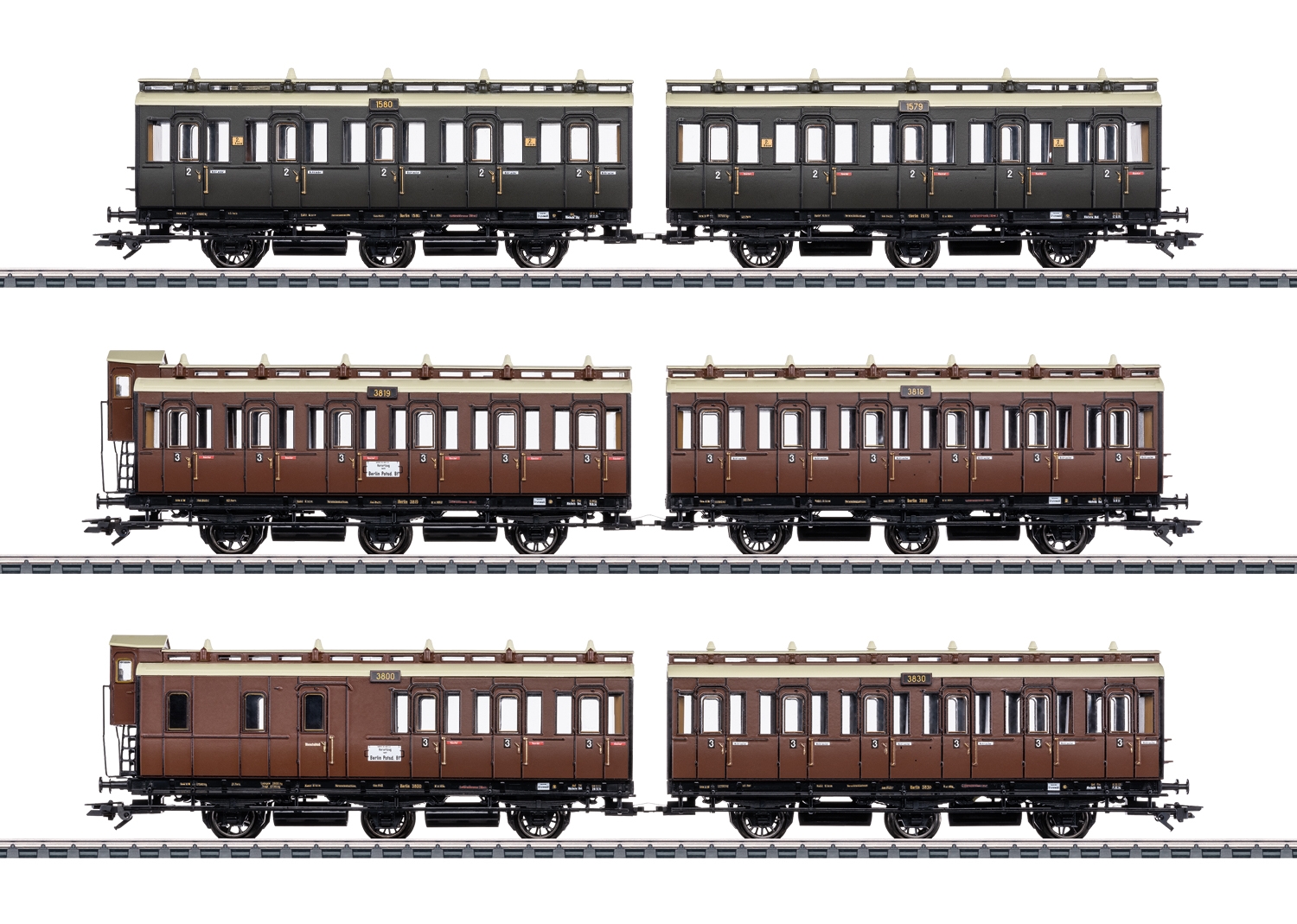 Prototype: Three 3-axle pairs of carriages of Prussian construction of the Royal Preussin Railway