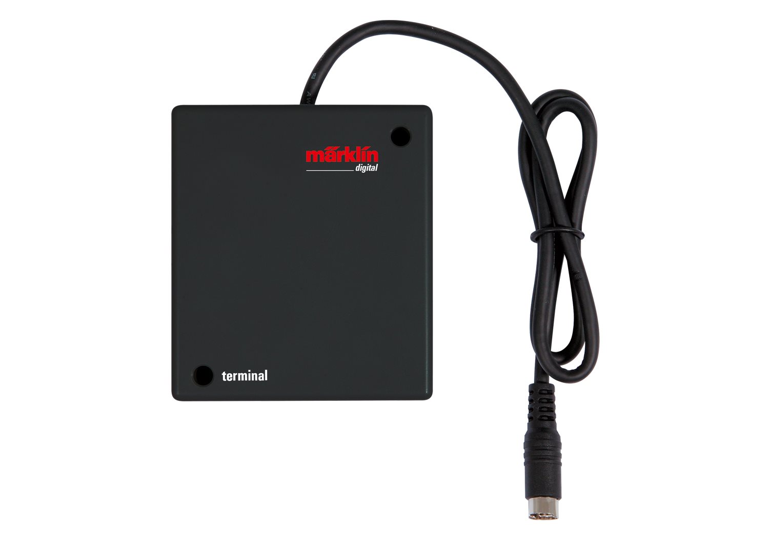Anschlussmöglichkeit für zusätzliche Geräte aus dem Digital-Programm an die Central Station. Festes 9-poliges Anschlusskabel, 60 cm lang (verlängerbar mit 60126) und 9-polige Buchse für ein weiteres Terminal oder andere Geräte an der Hauptleitung. 4 Buchsen 7-polig zum Anschluss von Mobile Station (Adapterkabel 60124 notwendig) oder anderer Peripheriegeräte. Abmessungen 96 x 85 x 40 mm.