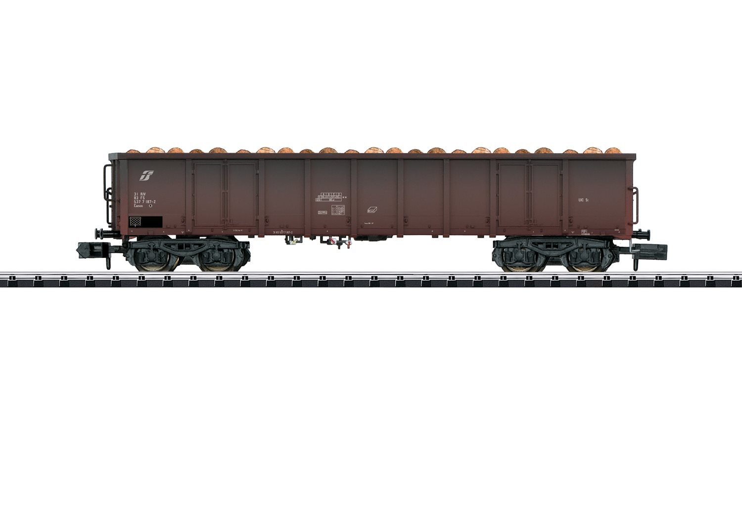 Vorbild: Hochbordwagen der Bauart Eanos der Italienischen Staatseisenbahn (FS). Einsatz: Nässeunempfindliche Ladegüter, hier Holz.