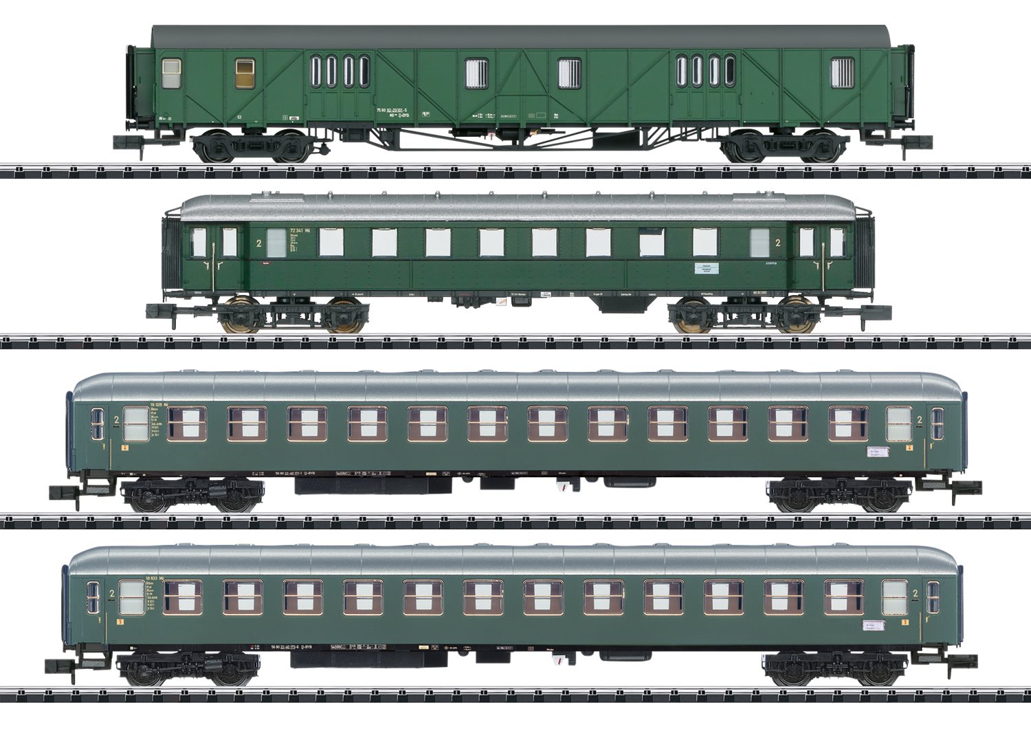 Modell: Alle Wagen mit Kinematik für Kurzkupplung. Vorbereitet für den nachträglichen Einbau einer Innenbeleuchtung. Ein Abteilwagen Büm ist ausgestattet mit einem LED-Zugschlusssignal. Gesamtlänge über Puffer 605 mm. Die dazu passende Innenbeleuchtung: 66616 LED-Innenbeleuchtung.