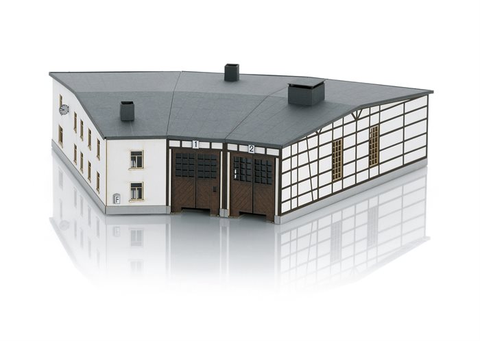 Ring-Lokschuppen "Rottweil". 3-ständiger Lokschuppen, der nebeneinander anbaubar ist. Zum vorbildorientierten Aufbau liegt der Werkstattanbau bei. Bewegliche Tore vorbereitet zum Öffnen mittels Servo-Motoren (nicht im Lieferumfang enthalten). Gleismittenabstand passend zur Drehscheibe 66570 (15-Grad-Teilung). Bausatz aus durchgefärbtem Architektur-Hartkarton, lasergeschnitten. Ausgestattet mit feinsten, lasergravierten Details. Ausführliche Bauanleitung. Maße (LxBxH) 3-ständiger Lokschuppen: 175 mm x 227 mm x 52 mm (L= Schuppenlänge).