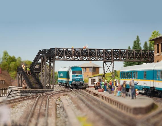 Der Grundbausatz des Fußgängerüberganges überspannt bis zu zwei Gleise. Er kann mit der Erweiterung jedoch beliebig ausgebaut werden und ist damit auch in größeren Bahnhofs-Bereichen einsetzbar. Inklusive Spezialkleber.